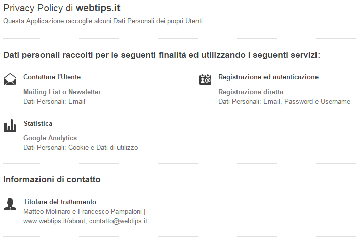 La cosa che più apprezzo del sistema di Iubenda è che non si preoccupa solo di risolvere un problema di chi gestisce i siti web, ma si preoccupa anche di migliorare l'esperienza dei navigatori! Infatti in realtà non viene generato un solo documento, ma due. Uno è il documento della privacy vero e proprio, scritto con tutti i crismi in perfetto "legalese"; il documento che nessuno legge mai insomma (vi sfido ad affermare di averlo fatto per i vari siti che visitate!). Il secondo documento è una privacy policy molto più user-friendly e breve, in cui è presente solamente una lista di funzionalità e i dati raccolti per mettere a disposizione quella funzionalità. Leggibile e comprensibile in 30 secondi, questo è l'esempio della privacy policy semplificata di webtips.it:
