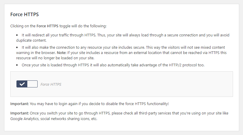 La sezione HTTPS è piuttosto semplice e permette semplicemente di indicare se forzare il traffico su HTTPS o meno.