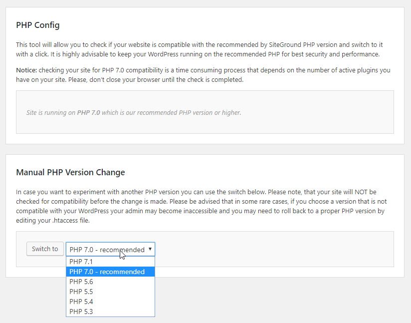 La sezione relativa alla configurazione PHP consente di scegliere una tra le varie versioni di PHP tra la 5.x e la 7.x. È sempre consigliabile utilizzare PHP 7 che da solo dà già un ottimo incremento generale delle prestazioni. Se per questioni di compatibilità è però necessaria la versione 5 è buona cosa avere la possibilità di scelta.